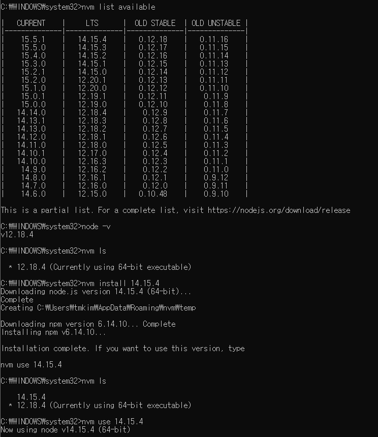 설치가 이미 되어있다면 nvm use 14.15.4 만 입력하면 됩니다.