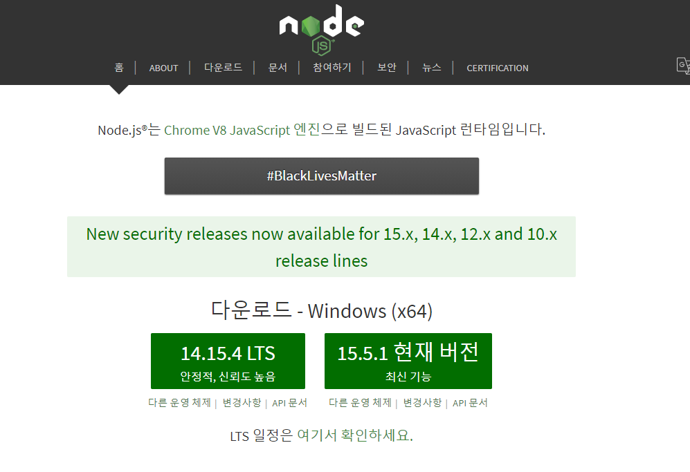 Node.js 홈페이지를 들어가 보면 버전이 LTS, Current로 나뉘는 것을 볼 수 있습니다.