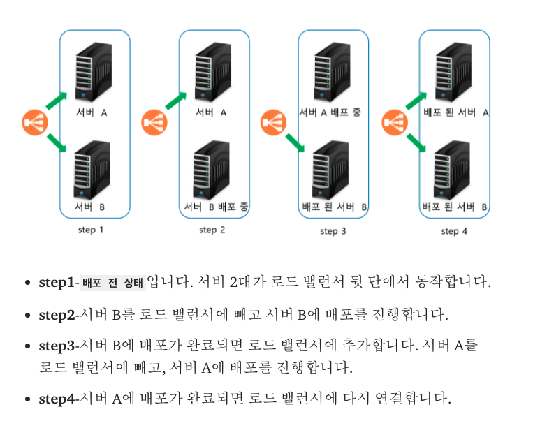 인스턴스 하나를 로드밸런서에서 라우팅하지 않게 한뒤 새 버전을 적용 후 다시 라우팅하는 방식