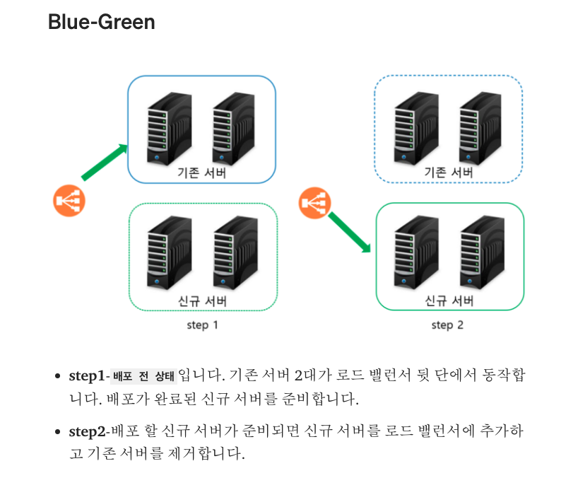 현재 인스턴스의 수만큼 새 버전의 인스턴스를 준비해 로드밸런서가 스위칭해주는 방식