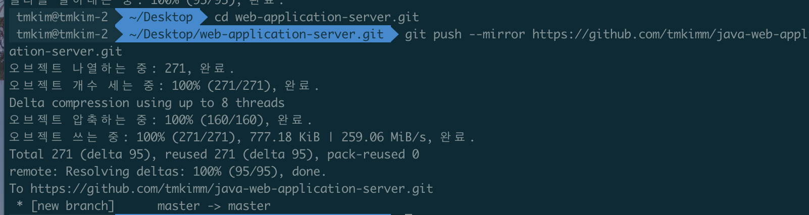 3. 새로운 저장소에 --mirror 옵션 저장소에 push