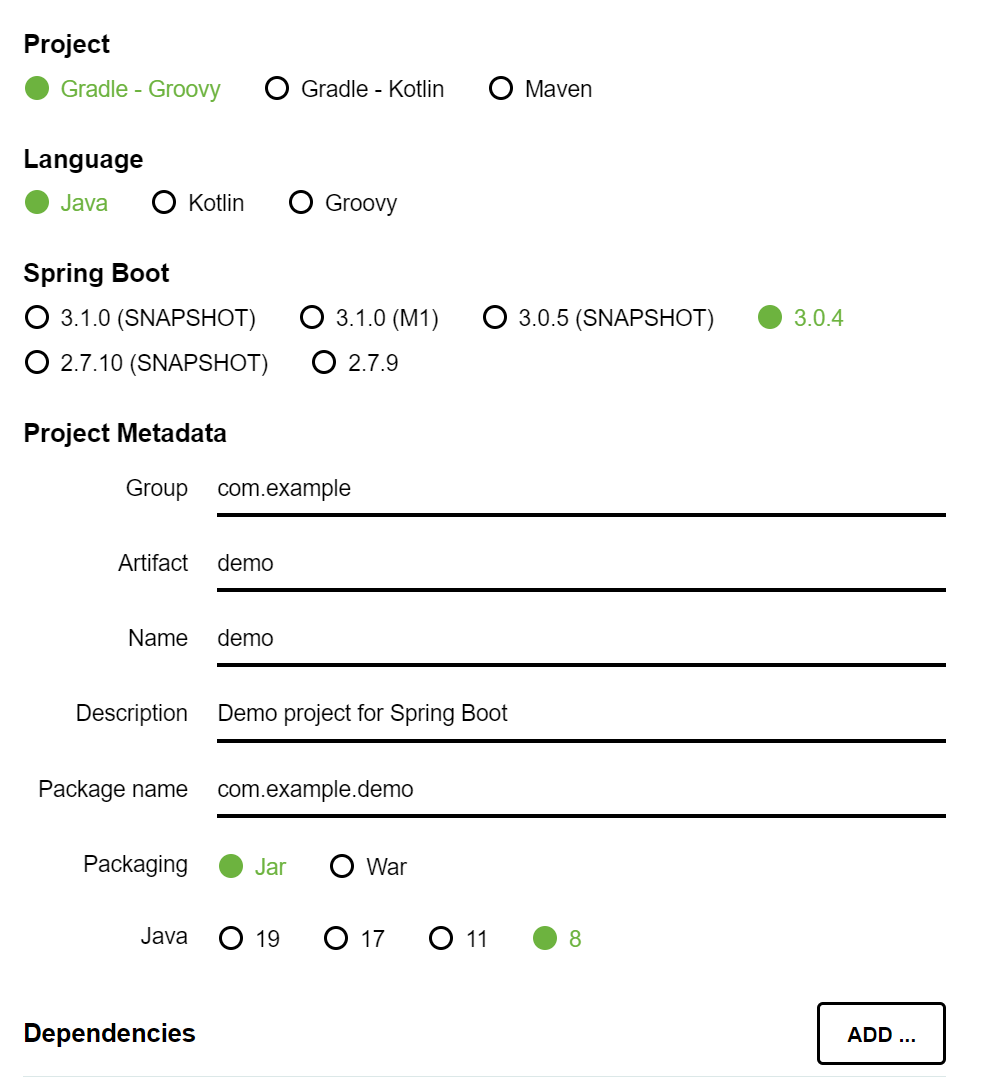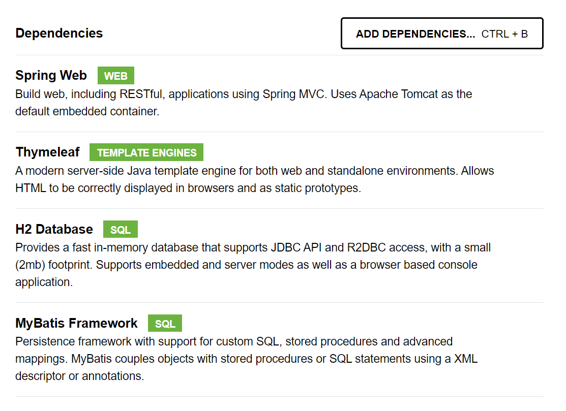 Project, Language 등 프로젝트 정보를 입력하고 Dependencies를 추가합니다.